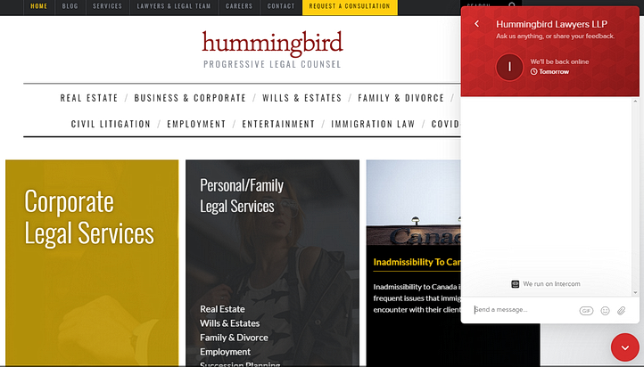 One good example is the Hummingbird Lawyers LLP website where visitors are greeted by a live chat option on the bottom right corner of the homepage: