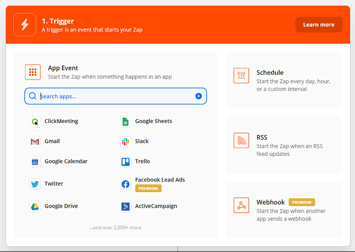 The first step is to choose a trigger, which will begin the automation. Search for an app to connect such as marketing software, an email inbox, etc. This will change depending on what you want to automate.