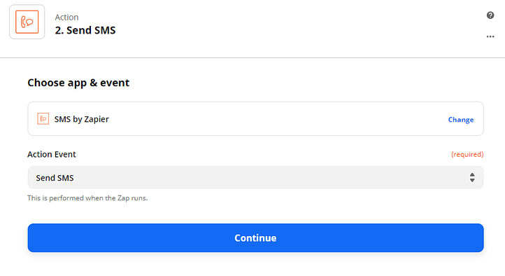 We can then connect the SMS by Zapier action to have a text message sent to a phone number.