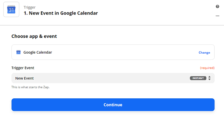 For example, we chose Google Calendar with the “New Event” trigger. When a new event is added to our calendar, we can automate another task to be performed.