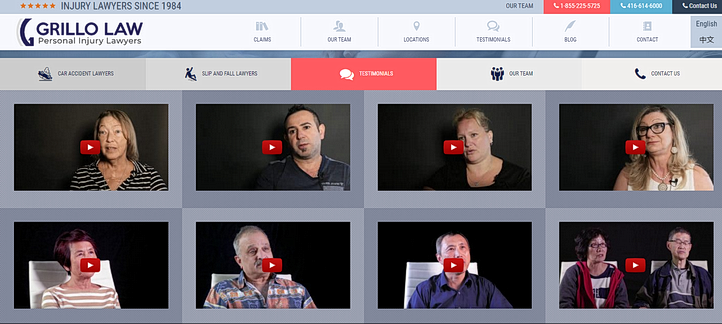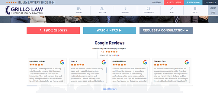 The first place to leverage testimonials or so-called online reviews is on your law firm’s website. These can be placed on the homepage, about page, service pages, and other important areas potential clients will see. Look how one of our clients, Grillo Law, has Google reviews on the homepage to build credibility and trust: