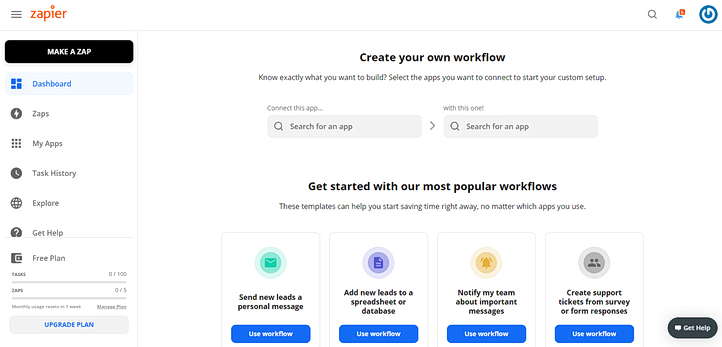 We recommend beginning with a platform like Zapier. It connects different software, websites, and marketing tools you’re using to create “Zaps,” combinations of sequences that automate things you do every day. Register for an account and click “Make a Zap” from the left sidebar.